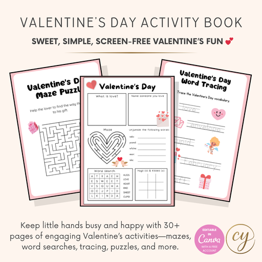View full detailsValentineβs Day Activity Book for Kids (30+ Pages) β Printable PDF Download