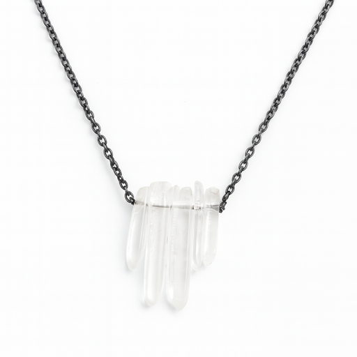 A gorgeous segment of natural quartz daggers is the focal point of this handcrafted necklace. Each crystal point is wire-wrapped tightly by hand and suspended from an 18 inch black oxidized sterling silver chain, finished with a secure spring ring clasp.