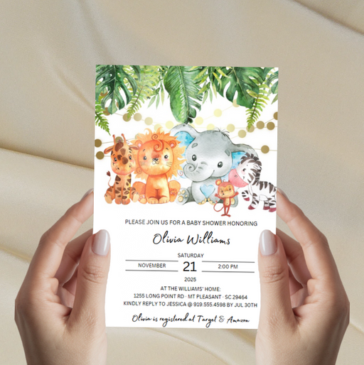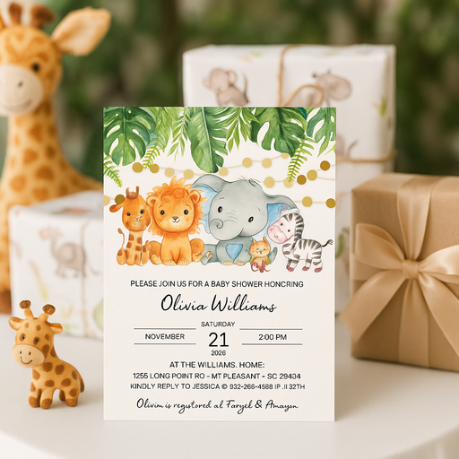 Celebrate your little one’s upcoming arrival with this charming Safari Baby Shower Invitation, featuring adorable watercolor jungle animals and lus...