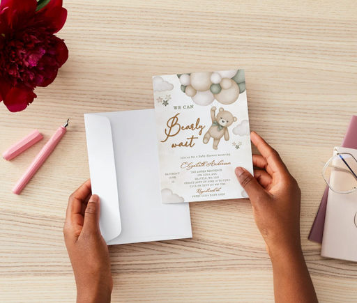 🐻 Sweet, soft, and oh-so-cute! Celebrate the upcoming arrival of a little bundle of joy with this “We Can Bearly Wait” Baby Shower Invitation. Feat...