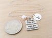 It features a stainless steel quote charm engraved with “Marriage Made You Family, Love Made You My Daughter”, paired with a hand-stamped silver initial disc and your choice of a wire-wrapped Swarovski crystal birthstone or freshwater pearl.