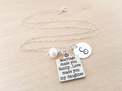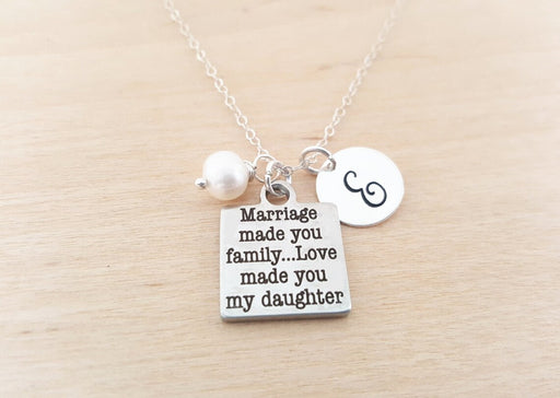 View full detailsMarriage Made You Family, Love Made You My Daughter Necklace β Sterling Silver with Birthstone & Initial Charm