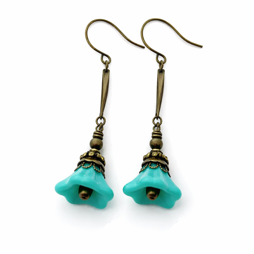 Add a splash of vintage charm with these handcrafted Czech glass flower earrings. Each earring features a delicate turquoise blue bell-shaped bloom...