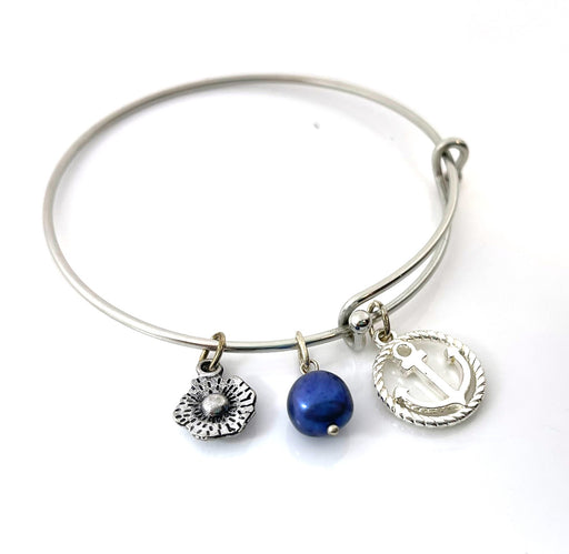 Stainless Steel Adjustable Charm Bangle β Freshwater Pearl, Flower & Anchor Charms β Handmade in Raleigh NC β Gift Box Included