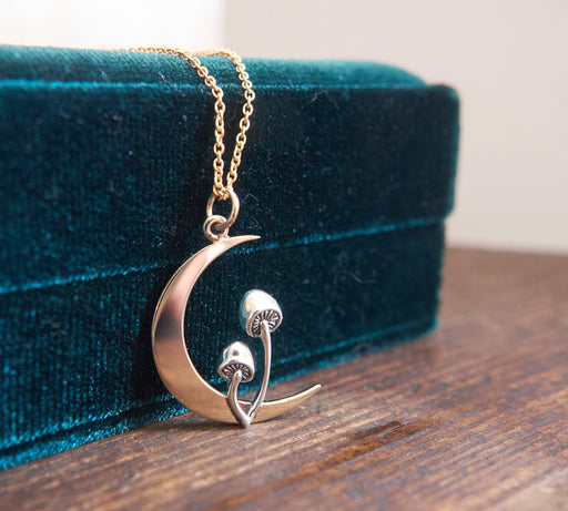 Channel a little woodland magic with this enchanting forager mushroom moon necklace. Handcrafted in Raleigh, this unique necklace features a cresce...