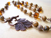 This necklace is hand crafted featuring earthy natural jasper stones and honey amber glass beads, individually attached by hand with copper findings and closed with a beautiful detailed copper leaf toggle clasp. This necklace measures 25 inches long.
