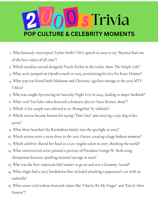 πΎ INSTANT DOWNLOAD β NO SHIPPING REQUIRED Get ready to throw it back with this fun and nostalgic 2000s Trivia Game!With over 100 questions across 7...