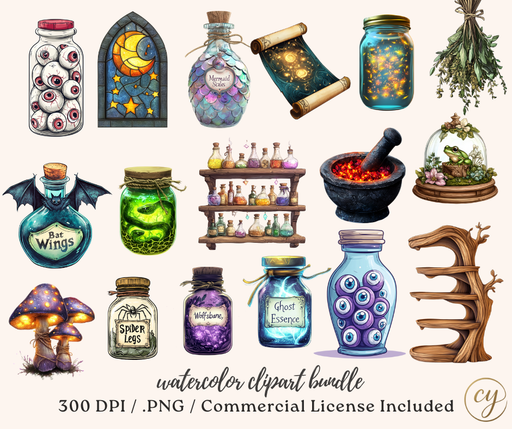 View full detailsEnchanted Apothecary Watercolor Clipart Bundle β 166 PNGs, 300 DPI, Commercial License