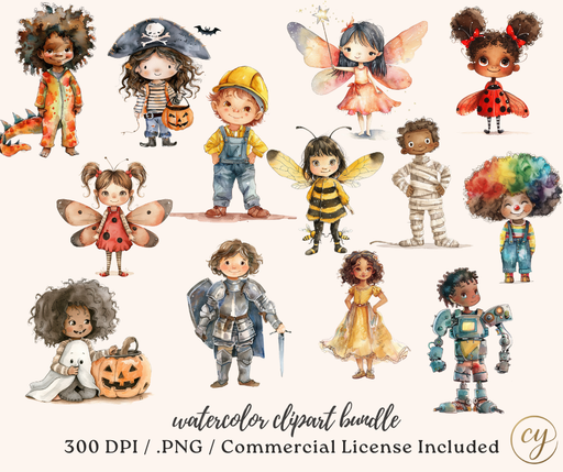 Bring the magic of Halloween to your creative projects with this adorable Kids in Costumes Watercolor Clip Art Bundle! This charming collection fea...