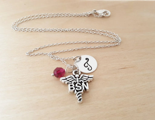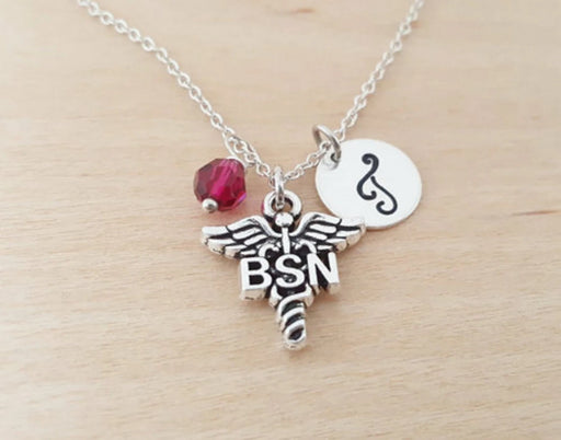 Personalized BSN Nurse Necklace – Sterling Silver Chain with Birthstone & Initial