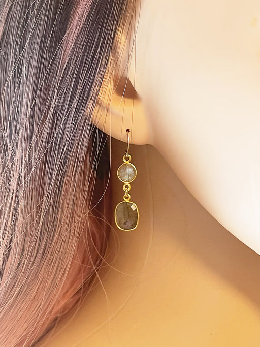 Step into the light with these enchanting double-drop earrings, handcrafted with genuine labradorite gemstones and finished with luxe 14k gold fill...