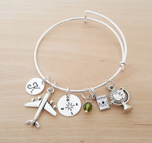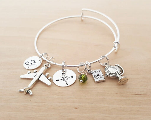 World Traveler Charm Bracelet β Adjustable Bangle with Personalized Initial & Birthstone