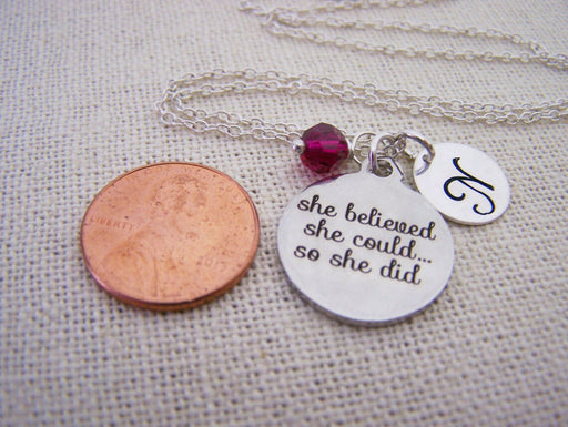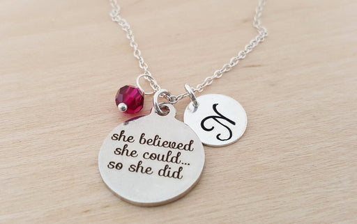 View full detailsβShe Believed She Could So She Didβ Necklace β Stainless Steel Charm with Sterling Silver Chain, Birthstone & Initial