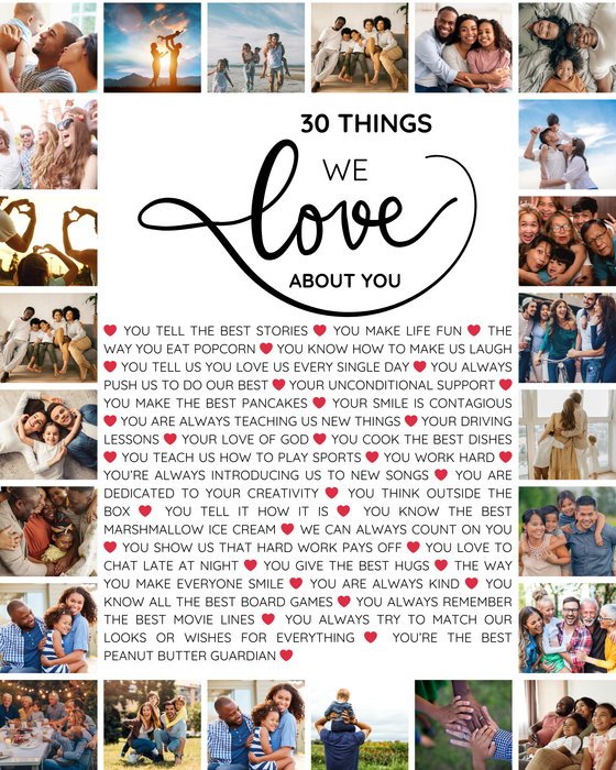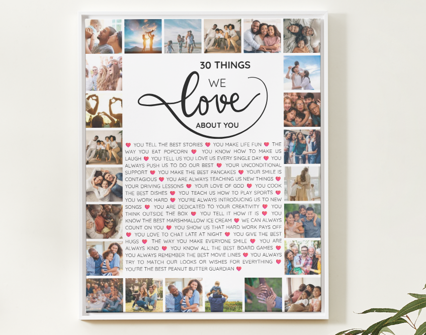 Make their 30th birthday unforgettable with a gift that comes straight from the heart. This editable Canva wall art template lets you highlight 30 things you love about them, paired with your favorite photos. Itβs meaningful, modern, and guaranteed to make them smile (and maybe cry a little).
