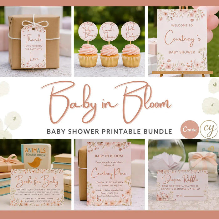 This beautifully coordinated set includes everything you need to host a memorable shower β all ready to customize and print easily from Canva. Perfect for a "Baby in Bloom" theme full of soft florals, sweet details, and personal touches.