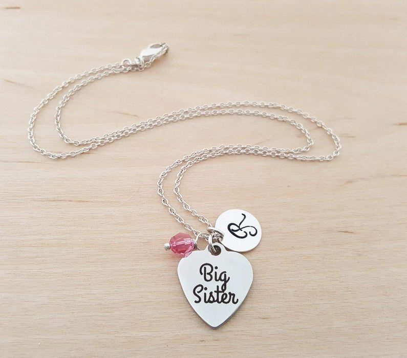 Celebrate the joy of sisterhood with this meaningful Big Sister charm necklace. The design features a stainless steel Big Sister charm paired with a hand‑stamped sterling silver initial disc for a personal touch. Choose from a sparkling Swarovski crystal birthstone or a luminous freshwater pearl to make it uniquely hers.