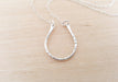 This dainty necklace is handcrafted featuring a detailed silver horseshoe charm. Attached to delicate Sterling silver chain, this necklace measures 18 inches long with secure spring ring closure.