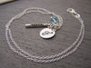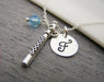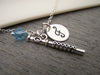 It features a detailed pewter flute charm, paired with a hand-stamped initial disc and your choice of a wire-wrapped Swarovski crystal birthstone.