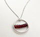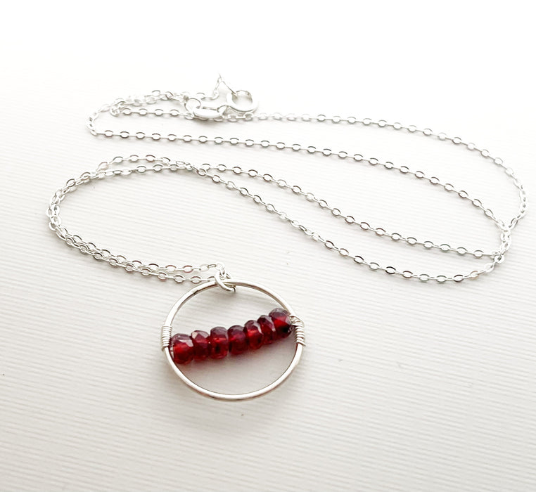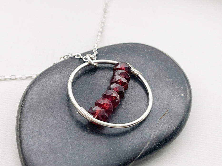 This handcrafted necklace features a stunning row of deep red garnet rondelles wire-wrapped across an open sterling silver circle. The slightly under 1-inch circular frame adds a clean, modern touch, while the rich garnet offers a natural, grounding energy.
