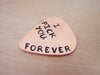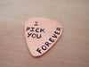 This guitar pick is hand stamped with "I Pick You Forever" into shiny raw golden brass, copper, silver tone or Sterling silver and hand painted with acrylic black paint to enhance the letters. This guitar pick measures 30 x 25 mm.
