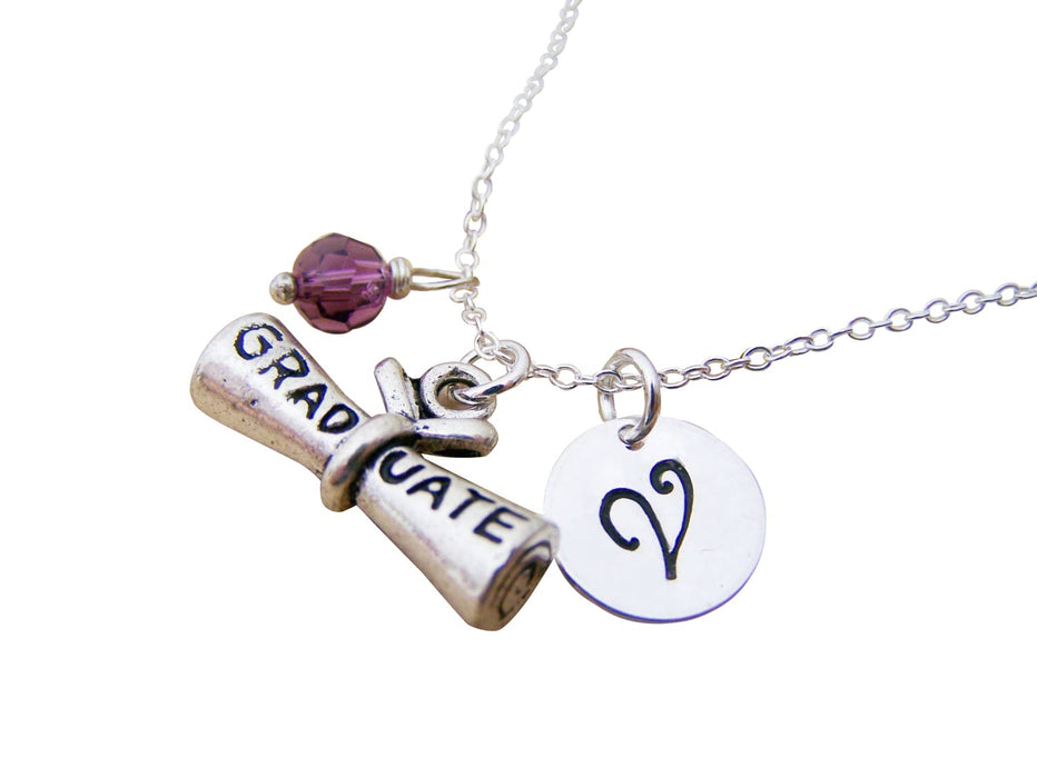 Featuring a detailed diploma charm, a personalized hand-stamped initial disc, and your choice of a sparkling Swarovski birthstone or classic freshwater pearl, this necklace is made to honor the hard work and milestones that matter most.