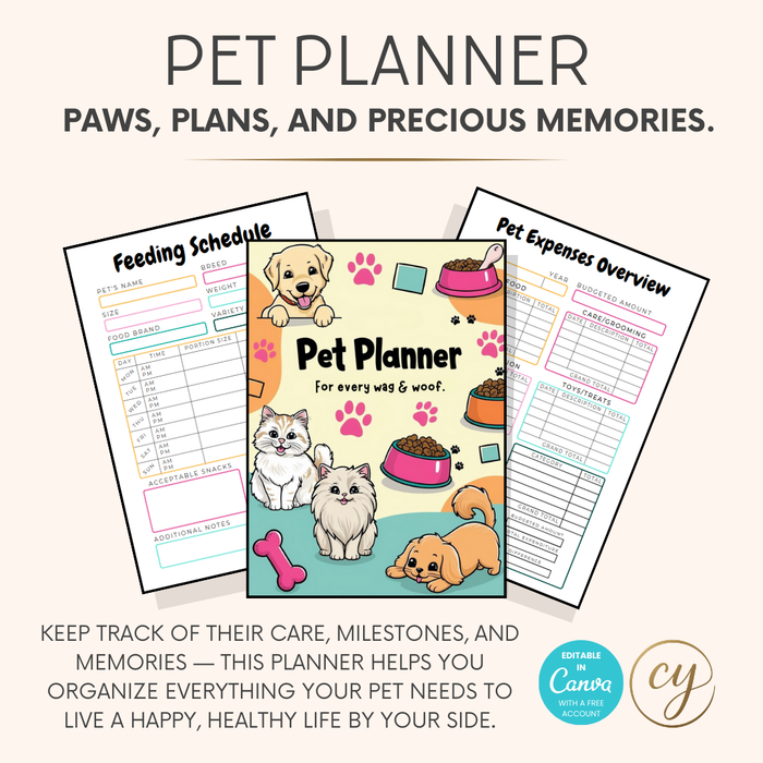 This 38-page Editable Pet Planner has everything you need to keep track of your furry friend's care, health, and routinesβall in one colorful, easy-to-use Canva template. Whether you're managing vet visits, feeding times, or leaving instructions for a sitter, this planner helps pet parents stay organized and stress-free.