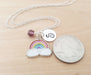 It features a colorful enameled rainbow charm, paired with a hand-stamped initial disc and your choice of a wire-wrapped Swarovski crystal birthstone.