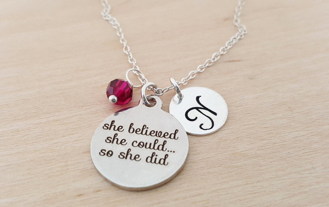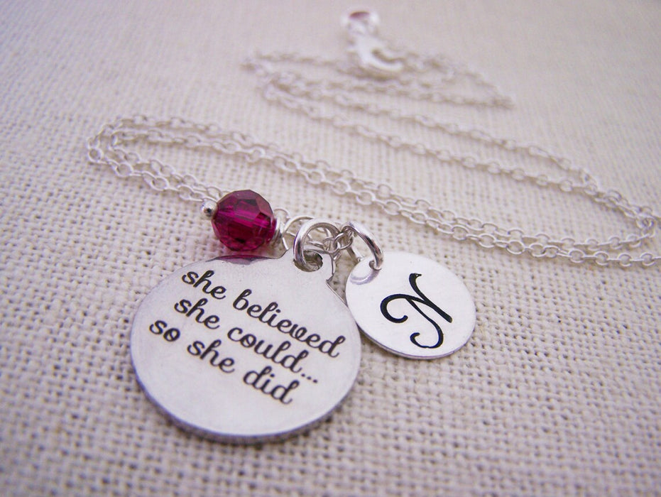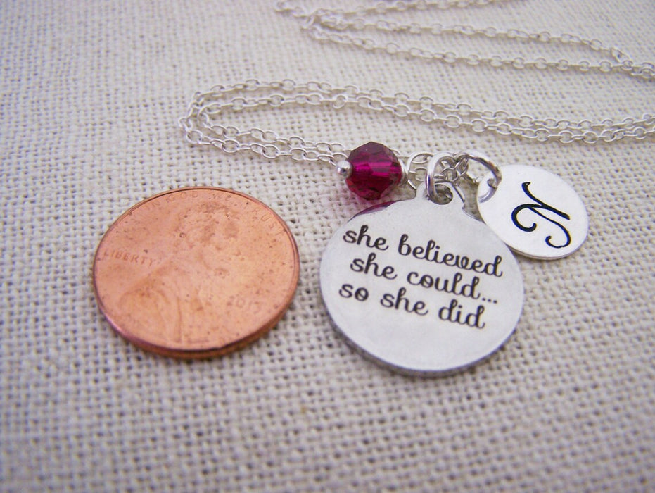 “She Believed She Could So She Did” Necklace – Stainless Steel Charm with Sterling Silver Chain, Birthstone & Initial