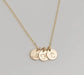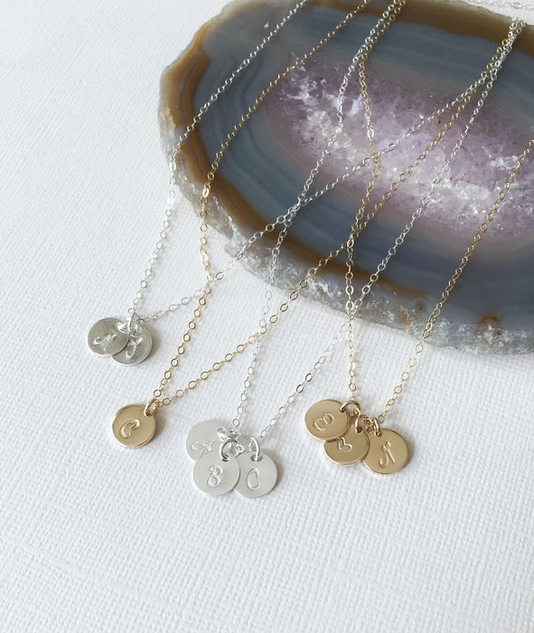 Dainty, personal, and made just for you. This tiny gold initial necklace features one or more 9mm gold-filled discs hand-stamped with your chosen letters. Suspended from a delicate 18" chain, it's perfect for everyday wear and layering.