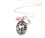 It features an oval pewter unicorn charm with detailed scrollwork framing the design, paired with a hand-stamped initial disc and your choice of a wire-wrapped Swarovski crystal birthstone.