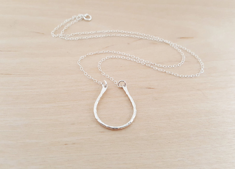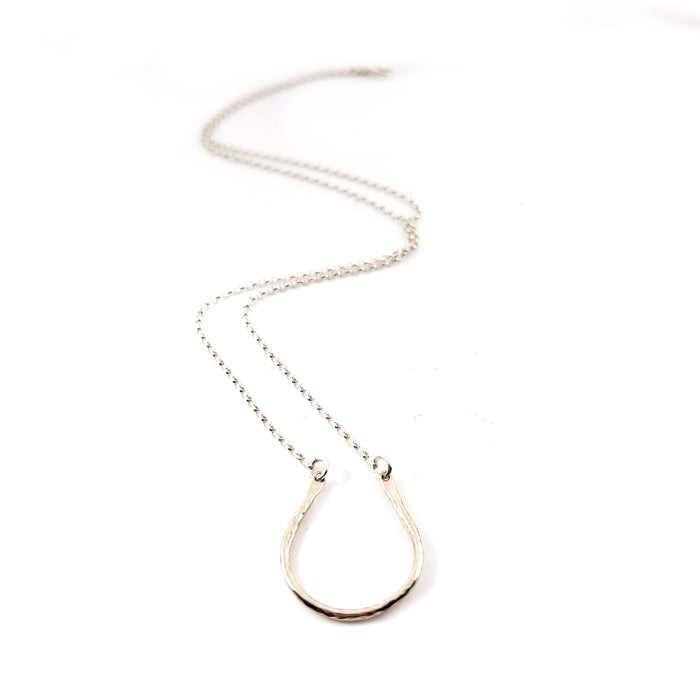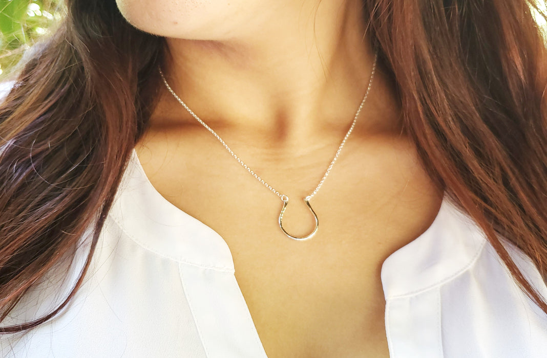 This dainty necklace is handcrafted featuring a detailed silver horseshoe charm. Attached to delicate Sterling silver chain, this necklace measures 18 inches long with secure spring ring closure.