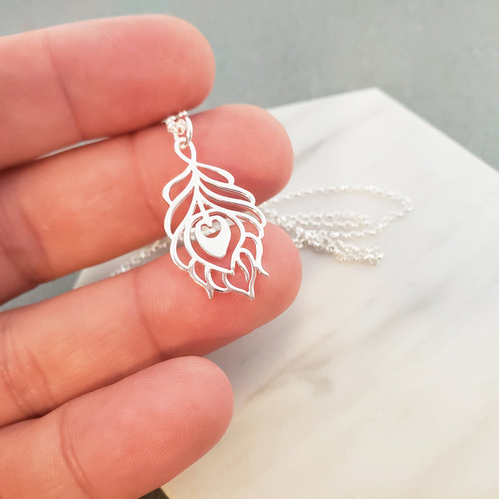 This dainty necklace is handcrafted featuring a detailed Sterling Silver Peacock Feather charm attached to a delicate 18 inch, Sterling Silver cable chain with clasp. Necklace comes on a beautiful insert card, printed on high quality 110lb card stock.Β