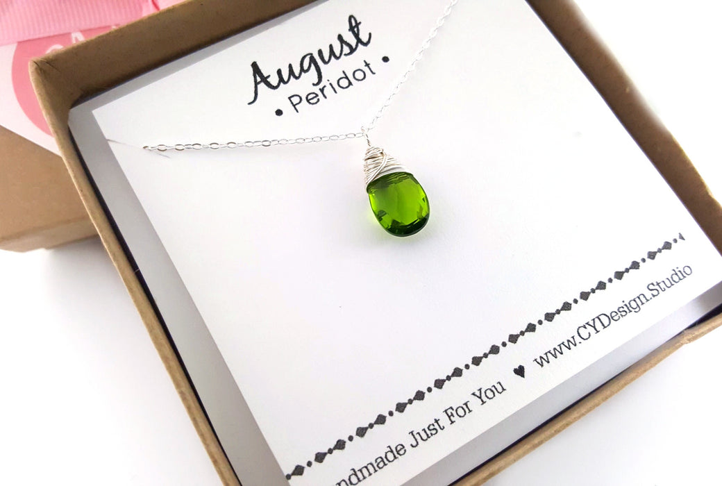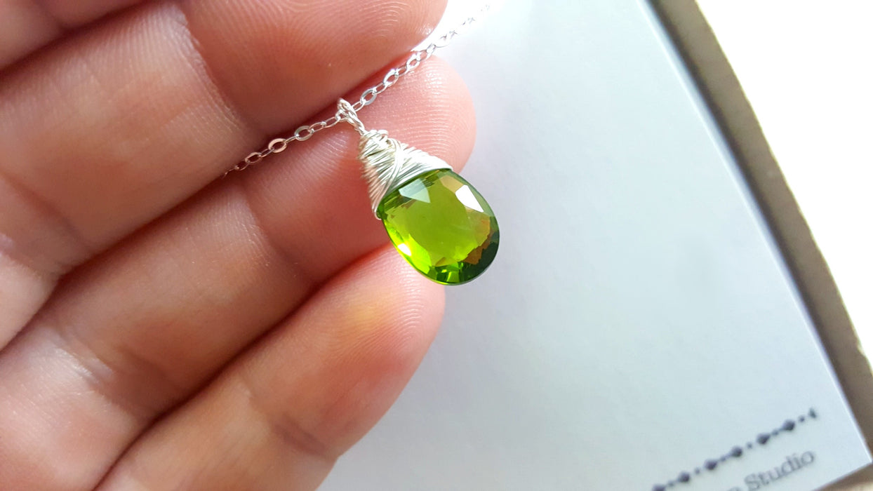 A beautiful August birthstone, Peridot Hydro Quartz gemstone briolette is the focal point of this handcrafted necklace. Wire wrapped tightly by hand with Sterling silver jewelers wire. Made to order to your specified length with shiny Sterling silver cable chain with secure spring ring closure. Includes handmade card insert.