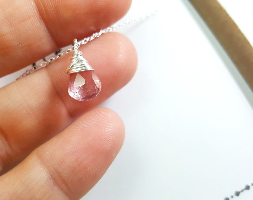 A beautiful October birthstone, Pink Tourmaline gemstone briolette is the focal point of this handcrafted necklace. Wire wrapped tightly by hand with Sterling silver jewelers wire. Made to order to your specified length with shiny Sterling silver cable chain with secure spring ring closure. Includes handmade card insert.