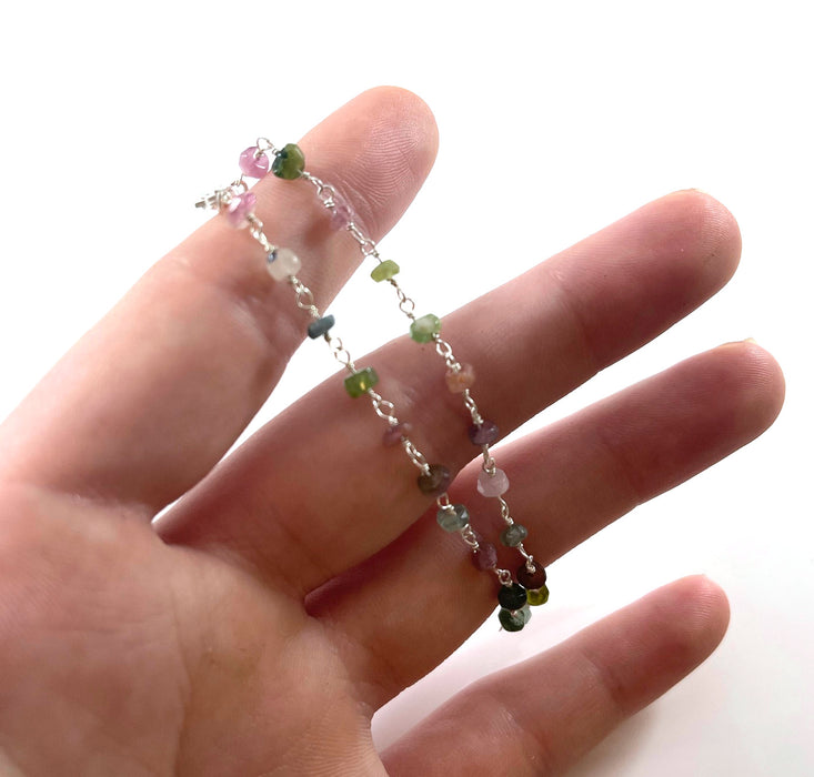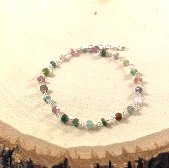 This bracelet is handcrafted featuring beautiful Tourmaline gemstone beads. Made with Sterling silver jeweler's wire, each gemstone is wire wrapped by hand. This bracelet is adjustable from 7 to 8 inches long with secure lobster clasp closure.