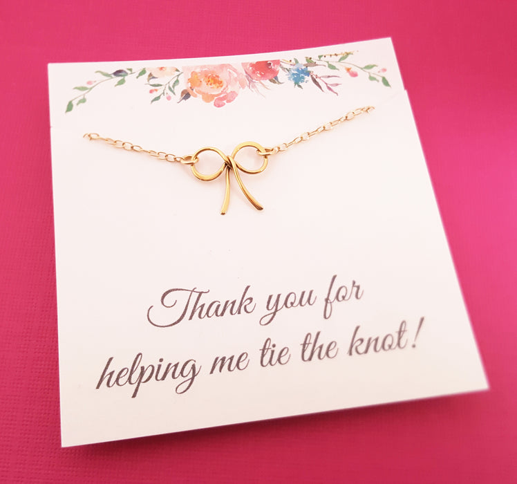 Thank You For Helping Me Tie The Knot! This Bridesmaid/Maid of Honor Necklace featuring a dainty gold bow on an 18 inch gold filled chain. The necklace comes in the necklace card as pictured and gift wrapped.Β