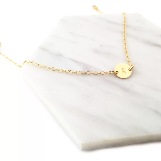 This dainty gold chain bracelet features a single initial hand-stamped on an 11mm gold disc. Please select initial from the drop down. Bracelets will be adjustable from 7-8 inches. Please request a longer extender in the notes to seller box if needed.