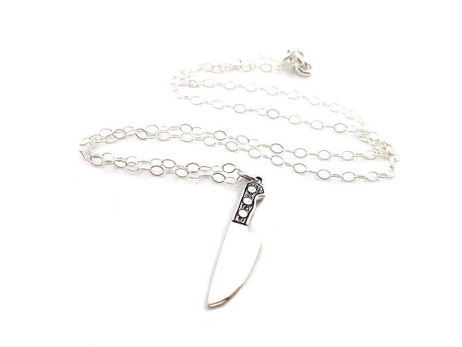 Comes on a simple sterling silver 18" cable chain with lobster clasp.  Knife charm measures 20x4mm, excluding jump ring.