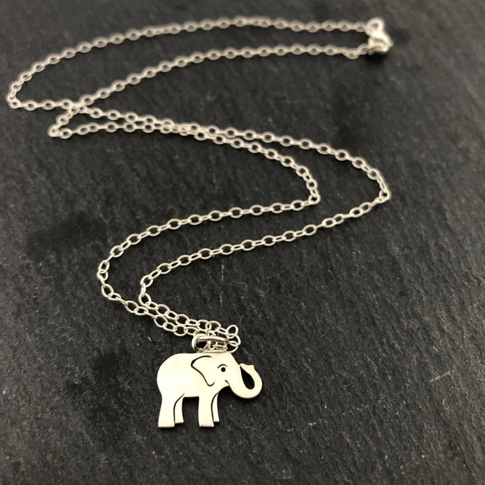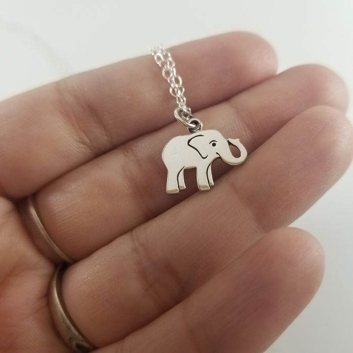 This dainty necklace is handcrafted featuring a detailed Sterling SilverΒ Elephant Charm attached to a delicate 18 inch, Sterling Silver cable chain with clasp. Necklace comes on a beautiful insert card, printed on high quality 110lb card stock.Β