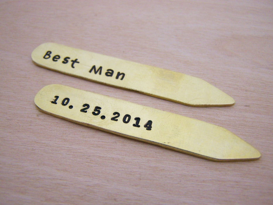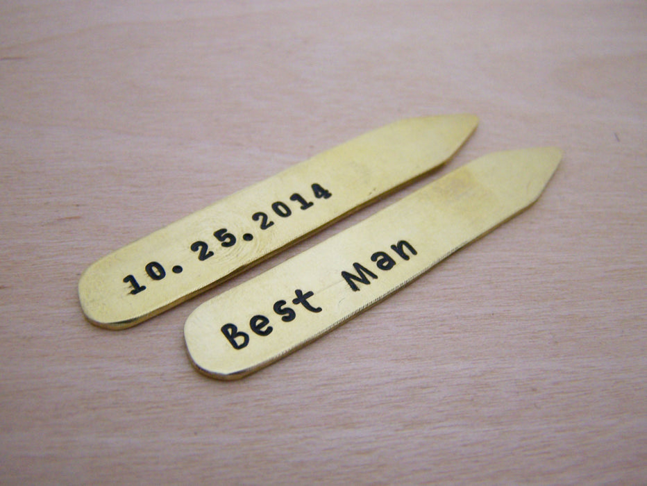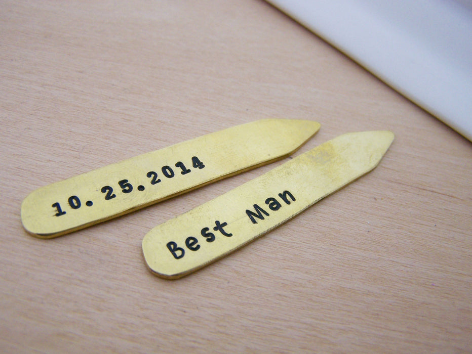 These handcrafted brass collar stays are custom hand-stamped with your wedding date, initials, or a special message — a timeless, personal gift for your best man, groomsmen, father of the bride, or groom.