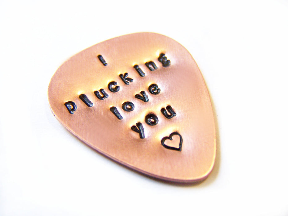 This custom guitar pick is hand stamped with your choice of phrase into shiny raw golden brass, silver or copper and hand painted with acrylic black paint to enhance the letters. This guitar pick measures 30 x 25 mm. Attached to a dark silver tone keychain.