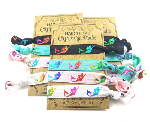 A set of four beachy mermaid hair ties in bright neon colors with rainbow foil mermaid print. Perfect accessories to tie up your tousles for a day ...