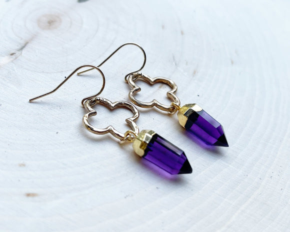 These earrings are handcrafted featuring gorgeous purple Amethyst gemstone daggers attached to open clover gold filled charms and 14k gold filled e...