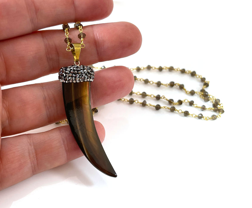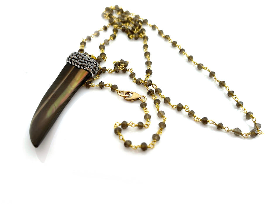 Brown Shell Pave Horn Smoky Quartz Long Rosary Chain Necklace