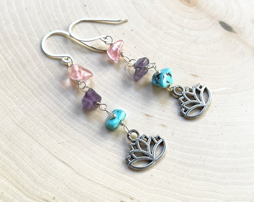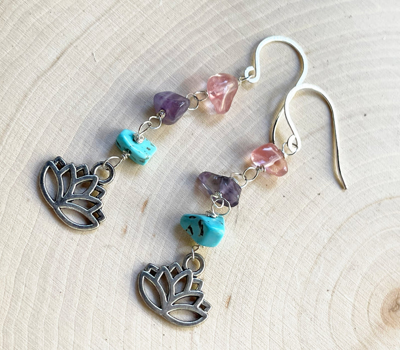These earrings are handcrafted featuring silver plated Lotus flower charms and wire wrapped gemstones of cherry quartz, amethyst, and turquoise.Β These earrings measure 2.5 inches long from top arch of handmade sterling earwires.