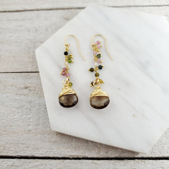 Smokey Topaz and Rainbow Tourmaline Gemstone 14k Gold Filled Earrings