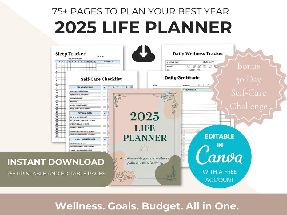 This 75+ page 2025 Life Planner is a printable and fully editable Canva template designed to help you track every part of your lifeβfrom mindset and wellness to meals, money, and big-picture goals.