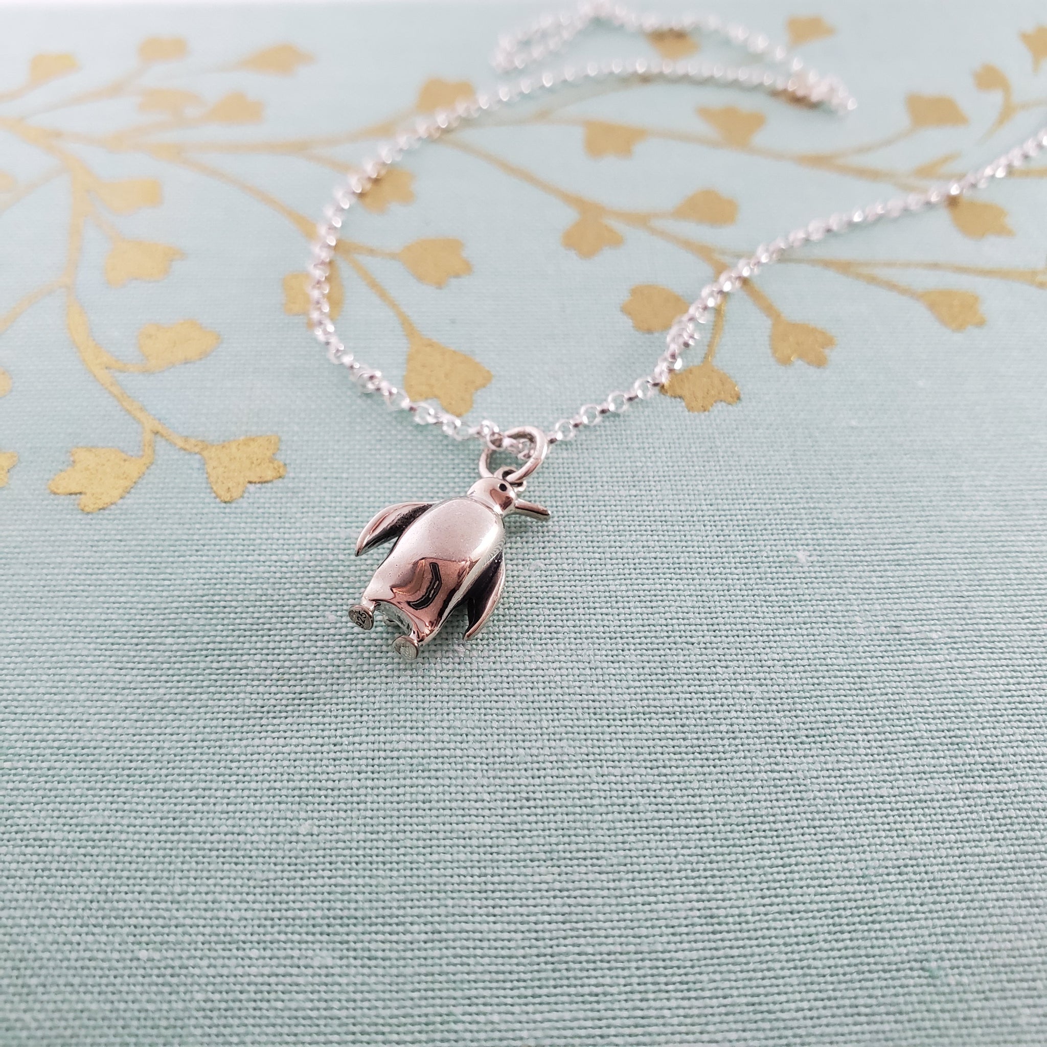 This dainty necklace is handcrafted featuring a detailed Sterling silver penguin charm attached to a delicate 16 inch, Sterling Silver cable chain with clasp. Necklace comes on a beautiful insert card, printed on high quality 110lb card stock.Β