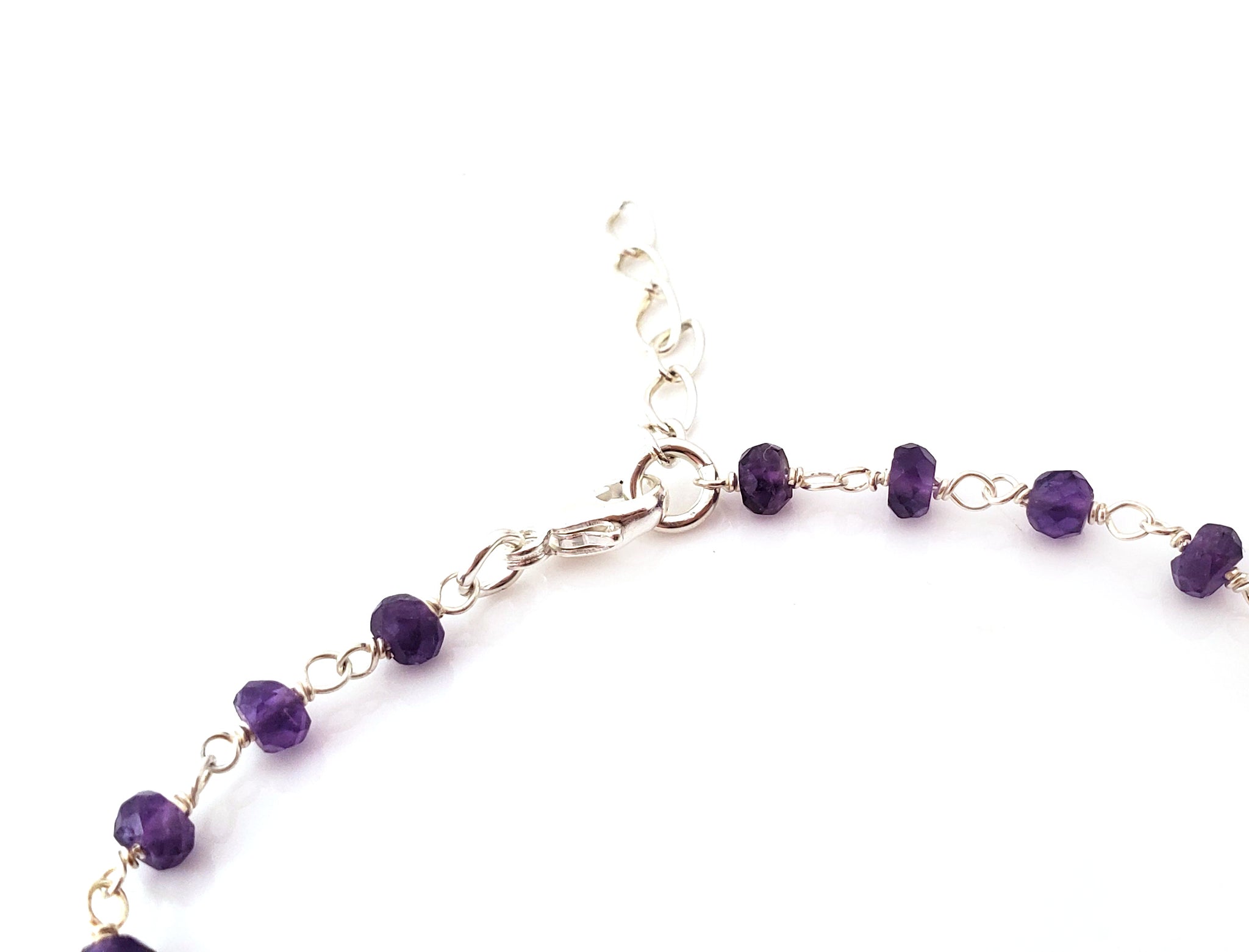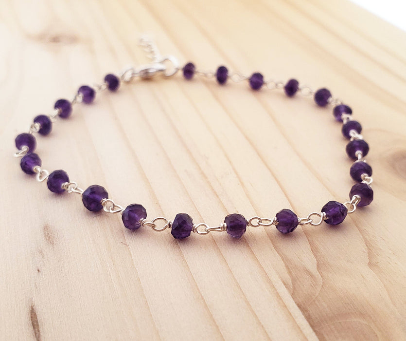This bracelet is handcrafted featuring beautiful Amethyst gemstone beads. Made with Sterling Silver jeweler's wire, each gemstone is wire wrapped by hand. This bracelet is adjustable from 7 to 8 inches long with secure lobster clasp closure. If you need a custom size or stone, just ask, we're happy to help!