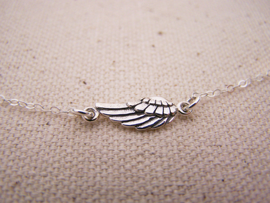 This necklace is handcrafted featuring a sideways detailed Sterling silver angel wing charm. made with high quality Sterling silver cable chain, this necklace measures 18 inches long with spring ring clasp.